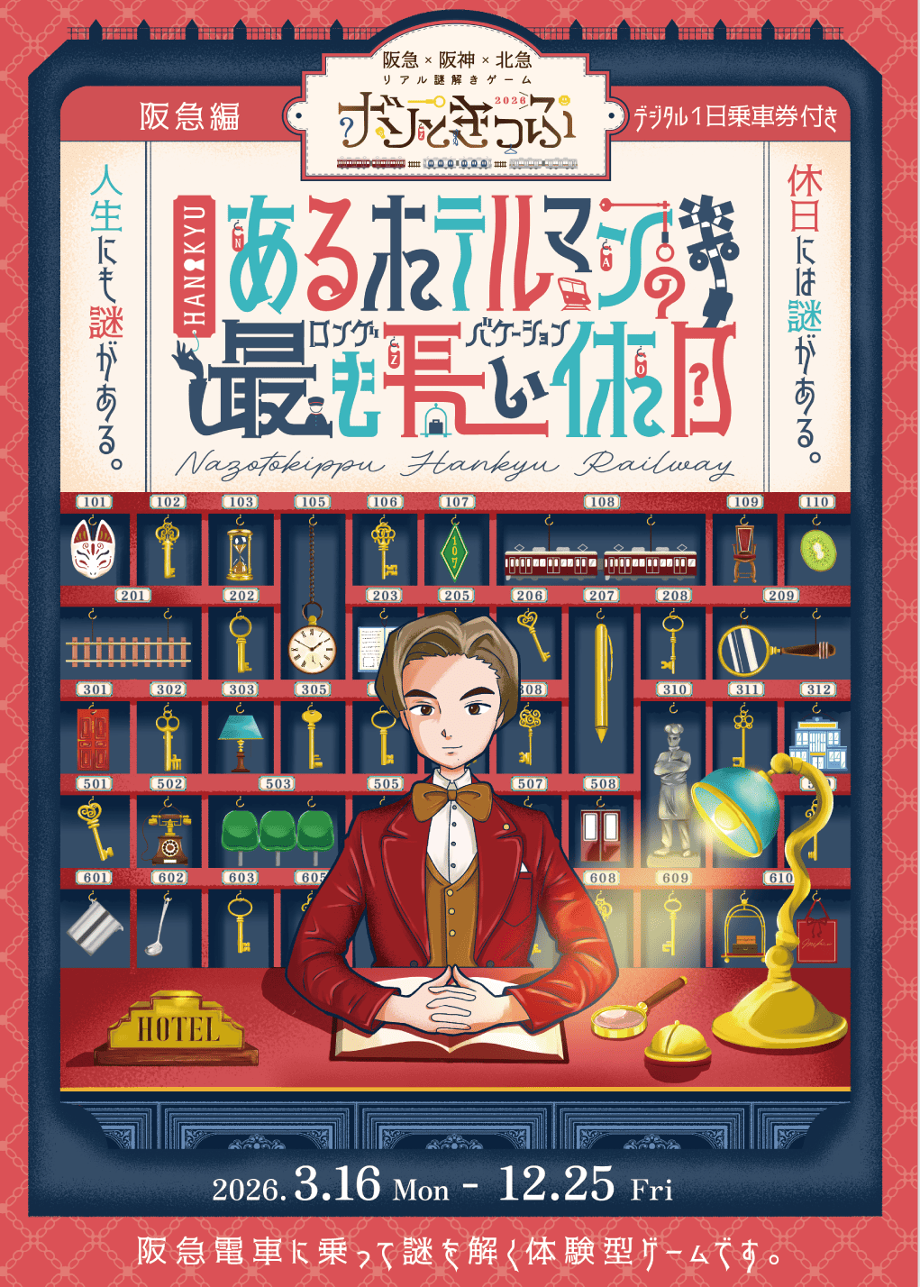 阪急電鉄株式会社様主催、株式会社フラップアルファゼロ様制作の『阪急×阪神×北急×リアル謎解きゲーム「ナゾときっぷ2026」~阪急編・あるホテルマンの最も長い休日~』の謎制作に参加させていただきました。※デザインは先方で制作